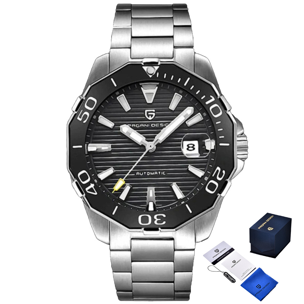 Годинник Pagani Design PD-1617 Silver-Black – це стильний чоловічий аксесуар, який поєднує елегантність та функціональність. Виготовлений з нержавіючої сталі, він має водонепроникність до 100 метрів, що робить його ідеальним для щоденного носіння та активного відпочинку. Цей механічний годинник з автопідзаводом оснащений стрілочним циферблатом, на якому зручно відображаються години, хвилини, секунди та число. Люмінесцентна підсвітка забезпечує хорошу видимість у темряві, а стильний сріблястий колір корпусу та браслета додає вишуканості. Годинник має розміри 47,6 х 47,6 мм та вагу 180 г, що робить його комфортним для носіння. У комплекті передбачено гарантію на 12 місяців. Країна виробника – Китай.