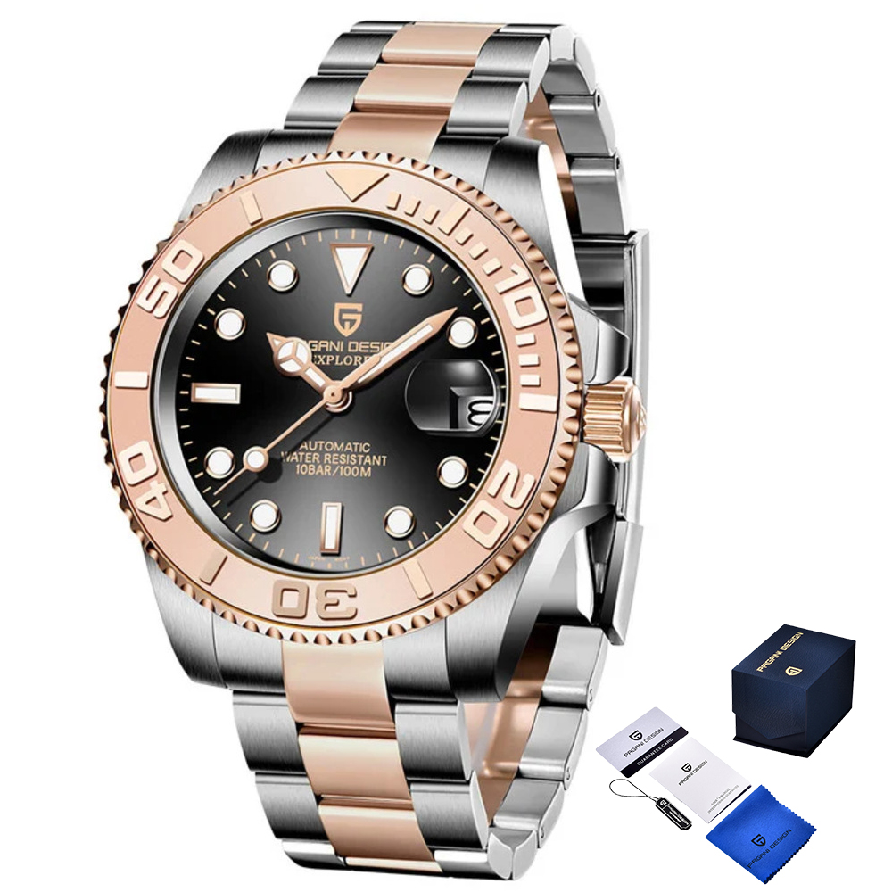 Pagani Design, механізм Механічний з автопідзаводом, корпус 40 х 40, матеріали Нержавіюча сталь, колір Золотий / Сріблястий, форма Кругла, стиль Класичний, індикація Стрілочний, тип кріплення Браслет, водозахист 100 м, скло Сапфірове