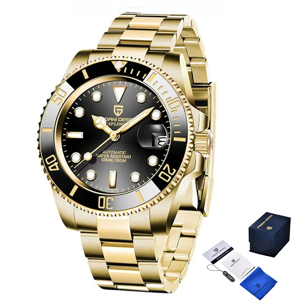 Pagani Design, механізм Механічний з автопідзаводом, корпус 40 х 40, матеріали Нержавіюча сталь, колір Золотистий, форма Кругла, стиль Сasual, Класичний, індикація Стрілочний, тип кріплення Браслет, водозахист 100 м, скло Сапфірове