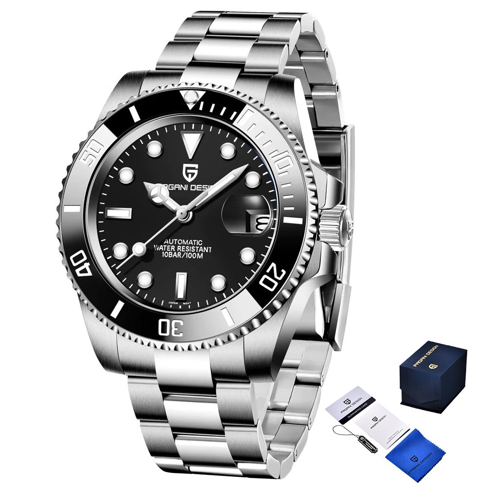 Pagani Design, механізм Механічний з автопідзаводом, корпус 40 х 40, матеріали Нержавіюча сталь, колір Сріблястий, форма Кругла, стиль Класичний, індикація Стрілочний, тип кріплення Браслет, водозахист 100 м, скло Сапфірове