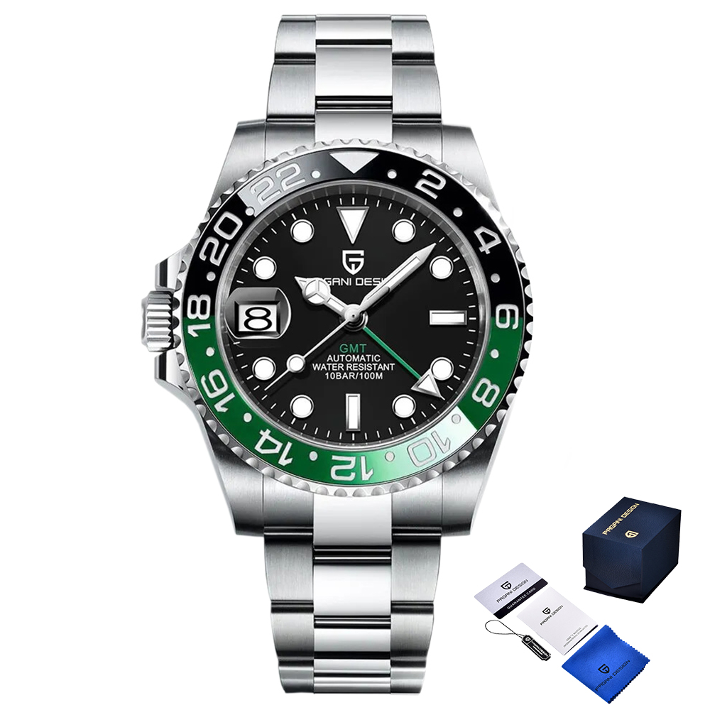 Pagani Design, механізм Механічний з автопідзаводом, корпус 40 х 40, матеріали Нержавіюча сталь, колір Зелений / Чорний / Сріблястий, форма Кругла, стиль Класичний, індикація Стрілочний, тип кріплення Браслет, водозахист 100 м, скло Сапфірове