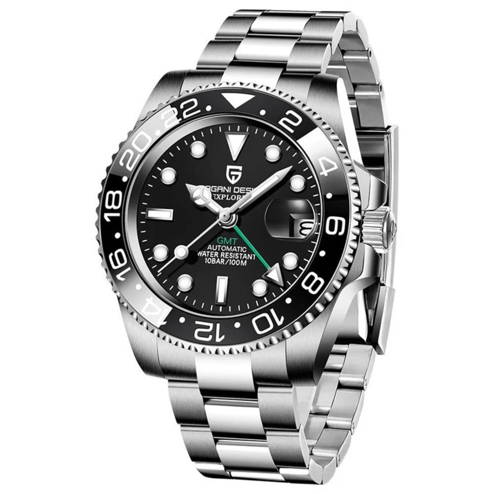 Pagani Design, механізм Механічний з автопідзаводом, корпус 40 х 40, матеріали Нержавіюча сталь, колір Чорний / Сріблястий, форма Кругла, стиль Сasual, Класичний, індикація Стрілочний, тип кріплення Браслет, водозахист 100 м, скло Сапфірове