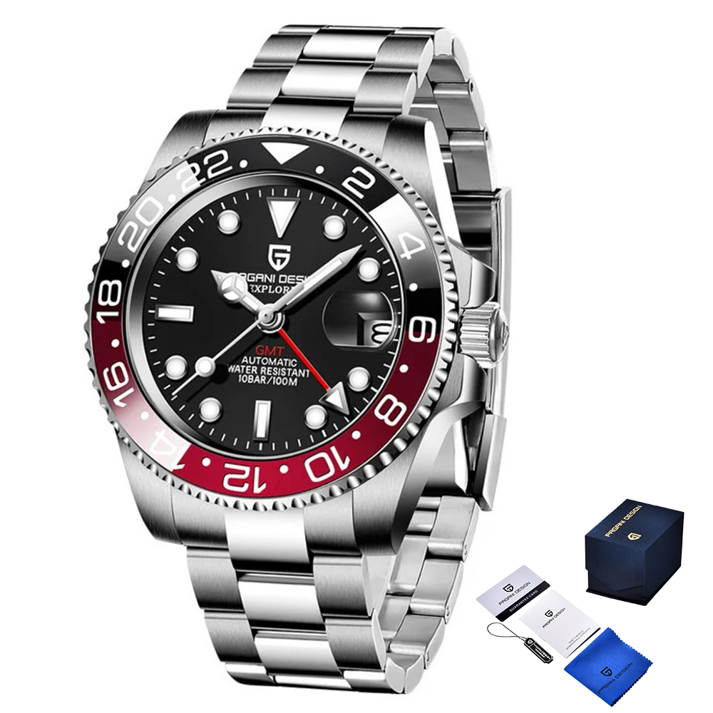 Pagani Design, механізм Механічний з автопідзаводом, корпус 40 х 40, матеріали Нержавіюча сталь, колір Чорний червоний / Сріблястий, форма Кругла, стиль Класичний, індикація Стрілочний, тип кріплення Браслет, водозахист 100 м, скло Сапфірове