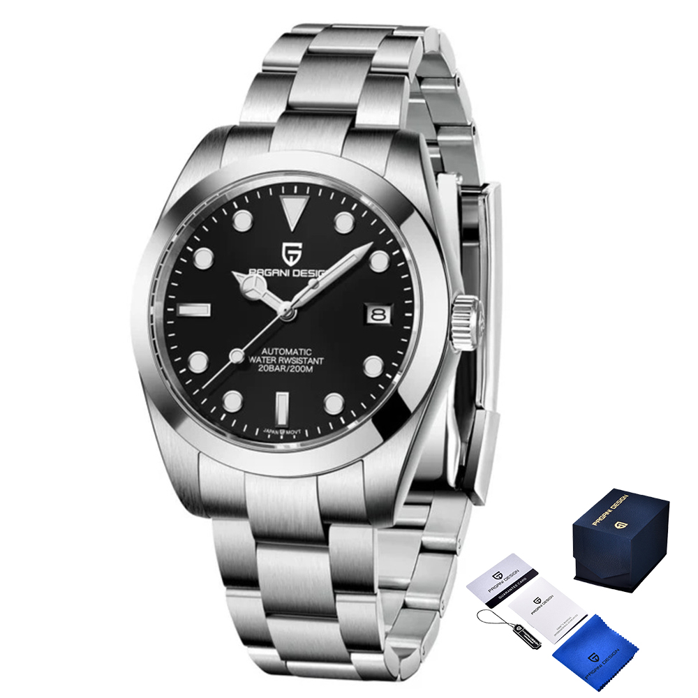 Pagani Design, механізм Механічний з автопідзаводом, корпус 40 х 40, матеріали Нержавіюча сталь, колір Сріблястий, форма Кругла, стиль Сasual, Класичний, індикація Стрілочний, тип кріплення Браслет, водозахист 200 м, скло Сапфірове