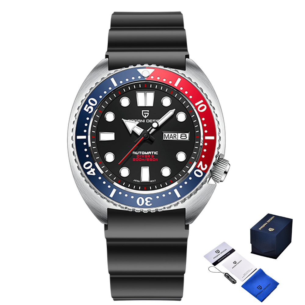Годинник Pagani Design PD-1696 Silver-Black Pepsi - стильний чоловічий аксесуар, що поєднує елегантність і функціональність. Корпус виготовлений з нержавіючої сталі сріблястого кольору, а ремінець з каучуку забезпечує комфортне носіння. Механізм з автопідзаводом гарантує точність часу, а сапфірове скло додає надійності. Годинник водонепроникний до 200 м, що робить його придатним для водних активностей. Циферблат з індексами та крапками має затримку на підсвічування, а функція календаря відображає місяць і число. Розмір корпусу - 45 х 45 мм, вага - 195 г. Годинник постачається з гарантією на 12 місяців.