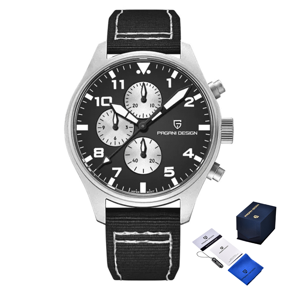 Pagani Design, механізм Кварцовий, корпус 42 х 42, матеріали Нержавіюча сталь / Нейлон/шкіра, колір Сріблястий / Чорний, форма Кругла, стиль Класичний, індикація Стрілочний, тип кріплення Ремінець, водозахист 100 м, скло Сапфірове