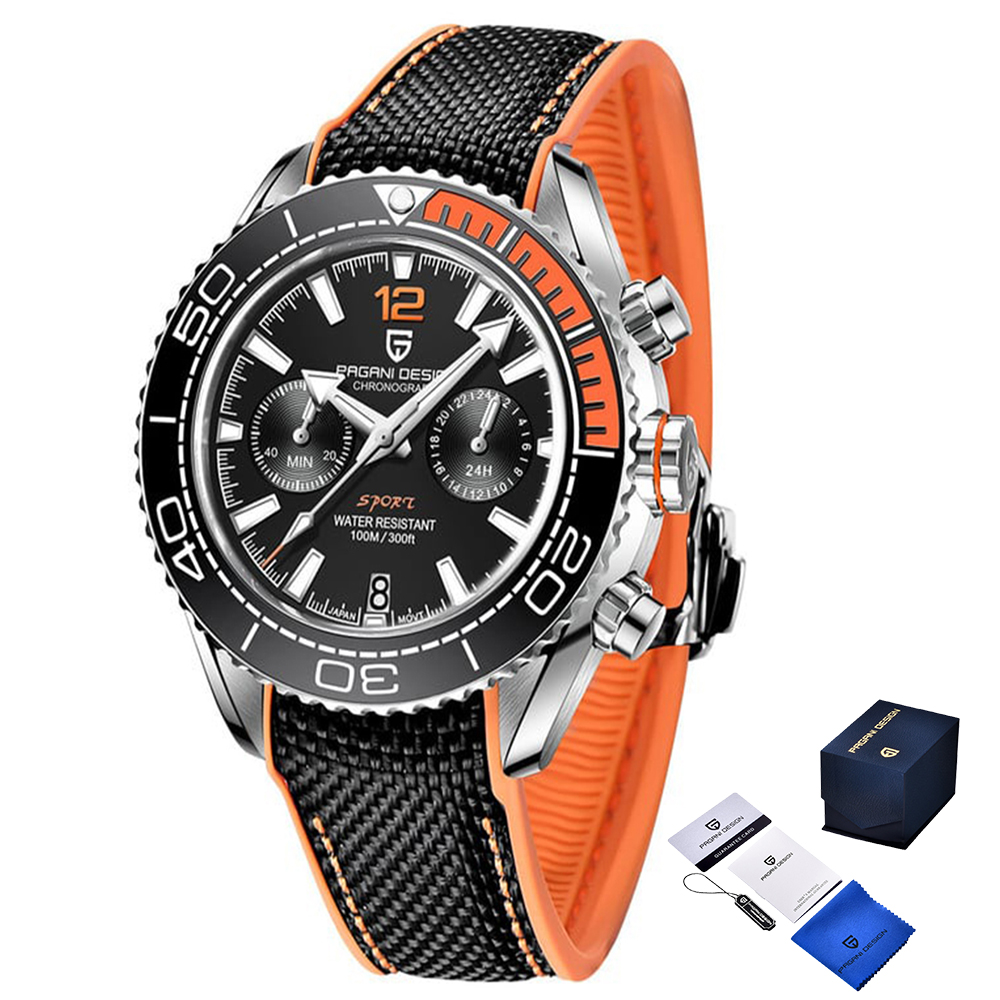 Pagani Design, механізм Кварцовий, корпус 40 х 40, матеріали Нержавіюча сталь / Нейлон, колір Сріблястий / Чорний, форма Кругла, стиль Сasual, індикація Стрілочний, тип кріплення Ремінець, водозахист 100 м, скло Сапфірове