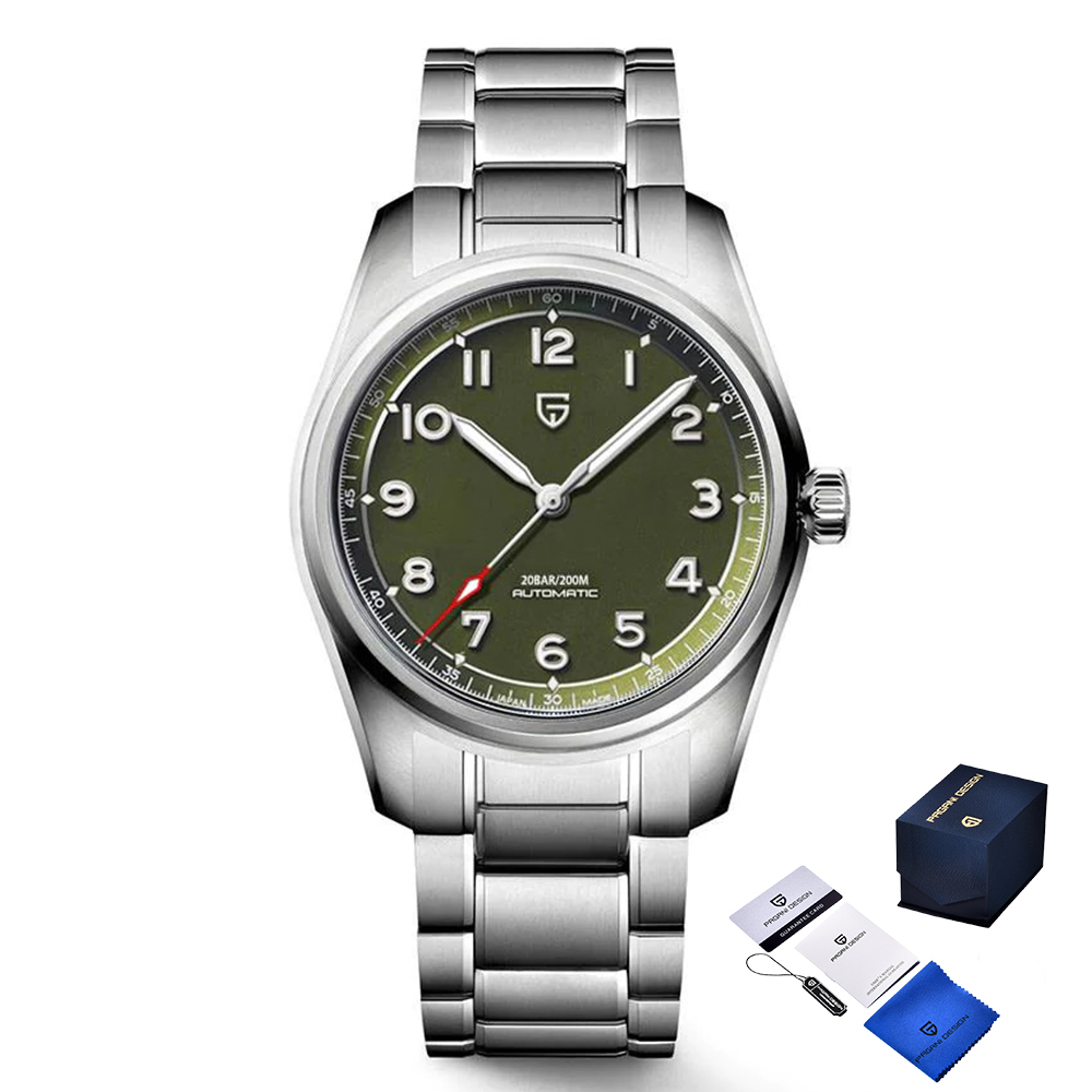 Годинник Pagani Design PD-1717 Silver-Green - стильний та практичний аксесуар для сучасного чоловіка. Виготовлений із нержавіючої сталі, цей годинник має круглу форму корпусу з сріблястим покриттям і сапфірове скло, що забезпечує високу стійкість до подряпин. Механічний з автопідзаводом механізм гарантує точність і надійність. Водонепроникність до 200 метрів робить його ідеальним для активного способу життя. Циферблат оснащений арабськими цифрами та люмінесцентною підсвіткою для зручного зчитування часу в будь-яких умовах. Довжина браслету становить 22 см, ширина - 20 см, а вага годинника - 143 г. Гарантія на виріб - 12 місяців. Бренд Pagani Design відомий своєю увагою до деталей та якістю виготовлення.
