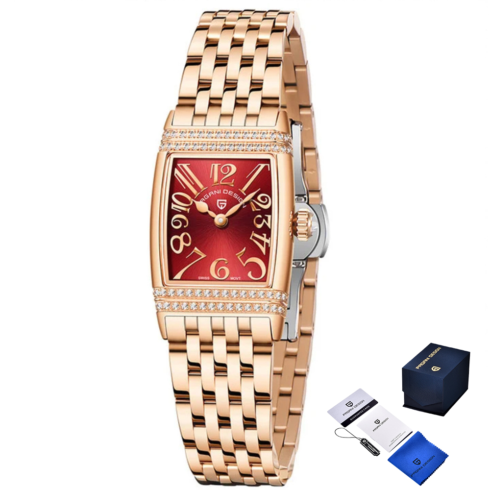 Годинник Pagani Design PD-1737 у розкішному золотистому кольорі з червоними акцентами — це стильний аксесуар для жінок, що поєднує елегантність і функціональність. Його корпус і ремінець виготовлені з нержавіючої сталі, що забезпечує довговічність і комфорт при носінні. Сапфірове скло захищає стрілочний циферблат з арабськими цифрами, що надає йому класичного вигляду. Крім того, годинник має водонепроникність до 50 метрів, що робить його придатним для повсякденного використання. Система кварцевого механізму гарантує точність часу, а стильний прямокутний корпус додає змістовності Вашому образу. Годинник поставляється з гарантією 12 місяців, тому ви можете бути впевнені у його якості та надійності.