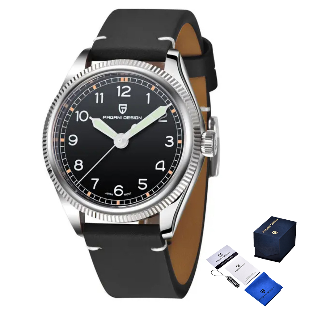 Pagani Design, механізм Кварцовий, корпус 40 х 40, матеріали Нержавіюча сталь / Шкіра, колір Сріблястий / Чорний, форма Кругла, стиль Сasual, Класичний, індикація Стрілочний, тип кріплення Ремінець, водозахист 100 м, скло Сапфірове
