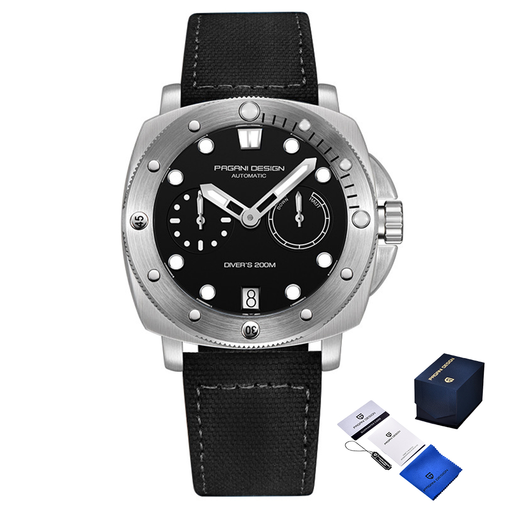 Pagani Design, механізм Механічний з автопідзаводом, корпус 49 х 41, матеріали Нержавіюча сталь / Нейлон, колір Сріблястий / Чорний, форма Кругла, стиль Сasual, Класичний, індикація Стрілочний, тип кріплення Ремінець, водозахист 200 м, скло Сапфірове