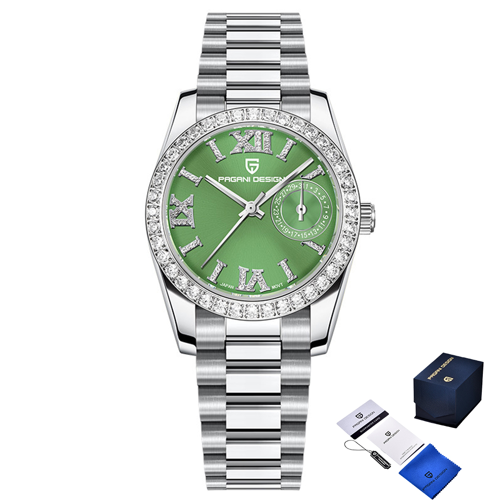 Годинник Pagani Design PD-1776 - втілення елегантності та стилю. Цей жіночий кварцевий годинник виготовлений з нержавіючої сталі, що забезпечує йому надійність і довговічність. Його круглий корпус має сріблястий відтінок, який гармонійно поєднується з таким же сріблястим ремінцем-браслетом. З водонепроникністю до 100 метрів, цей годинник ідеально підходить для активного способу життя. Сапфірове скло надає йому додаткової стійкості до подряпин. Циферблат з індексами та арабськими цифрами забезпечує легкість в читанні часу. Розмір годинника складає 41 х 32 мм, а його вага - 131 г. Годинник має 12-місячну гарантію і виготовлений в Китаї, що підтверджує високу якість продукції бренду Pagani Design. Стильний та функціональний, цей годинник стане відмінним доповненням до будь-якого образу.