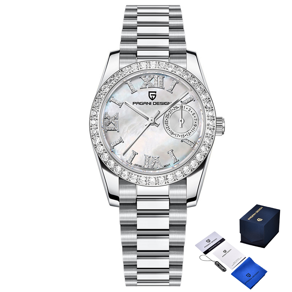 Годинники Pagani Design PD-1776 Silver-White – елегантний аксесуар для сучасної жінки. Виготовлений з нержавіючої сталі, цей годинник має сріблястий корпус і ремінець. Діаметр годинника складає 32 мм, а сапфірове скло забезпечує високу стійкість до подряпин. Завдяки водонепроникності до 100 м ви можете не турбуватися про вологу. Кварцовий механізм з стрілочним циферблатом має функцію календаря та індикацію годин, хвилин і секунд. Стильний casual та класичний дизайн робить його ідеальним доповненням до будь-якого вбрання. Гарантія – 12 місяців.