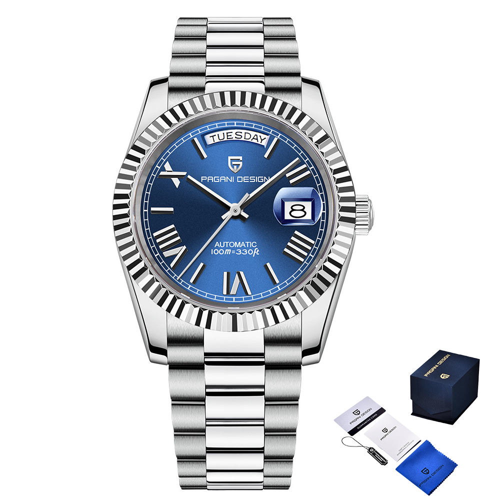 Годинник Pagani Design PD-1783 Silver-Blue - це стильний чоловічий аксесуар, виконаний у класичному та casual стилі. Корпус виготовлений з нержавіючої сталі сріблястого кольору і має круглу форму розміром 40 х 40 мм. Він оснащений механічним механізмом з автопідзаводом та сапфіровим склом, що гарантує високу надійність і стійкість до подряпин. Годинник водонепроникний на глибину до 100 м та має індикацію годин, хвилин, секунд і числа. Ремінець також виконаний зі сталі та має довжину 20 см. Годинник забезпечений гарантією на 12 місяців і стане чудовим доповненням до вашого стилю.