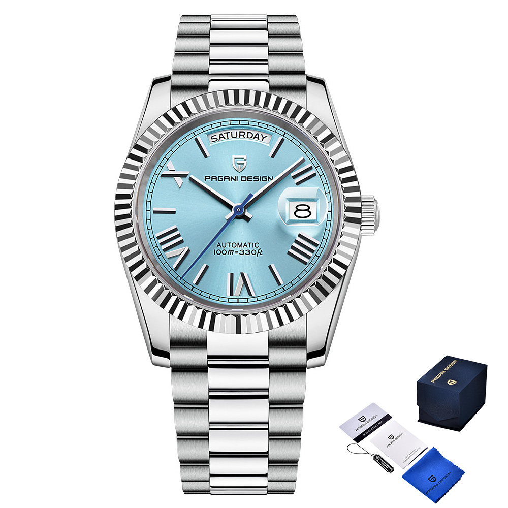 Годинник Pagani Design PD-1783 Silver-Tiffany - стильний аксесуар для сучасного чоловіка. Він поєднує вишуканий дизайн та функціональність. Корпус і ремінець виготовлені з нержавіючої сталі сріблястого кольору, що додає елегантності. Годинник має механічний механізм з автопідзаводом та сапфірове скло, що забезпечує високу зносостійкість. Водонепроникність до 100 метрів дозволяє використовувати його під час активного відпочинку. Циферблат має стрілочну індикацію з арабськими цифрами та крапками, а також функцію календаря. Стиль годинника універсальний - він підходить як для класичного, так і для повсякденного (casual) образу. Гарантія на виріб - 12 місяців.