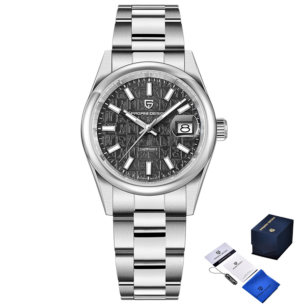 Годинник Pagani Design PD-1794M Silver-Black Представляємо стильний чоловічий годинник Pagani Design PD-1794M, який ідеально поєднує класичний дизайн та сучасні технології. Цей годинник з механічним автопідзаводом має витончений сріблястий корпус з нержавіючої сталі діаметром 39 мм та круглу форму, що підкреслює його елегантність. Сапфірове скло забезпечує високу стійкість до подряпин, а водонепроникність до 50 метрів робить його ідеальним супутником для активних чоловіків. Ремінець з того ж матеріалу надійно фіксує годинник на зап'ясті та надає йому вишуканого вигляду. Циферблат цього виробу простий та зрозумілий, із яскравими індексами, які дозволяють легко відстежувати час. Годинник має функції індикації годин, хвилин та секунд і стане відмінним доповненням до будь-якого casual або класичного стилю. Pagani Design PD-1794M – це не лише стильний аксесуар, а й надійний і функціональний гаджет, на який ви можете покластися в будь-який момент. Обирайте якість та стиль з годинником Pagani Design! Термін гарантії – 12 місяців.