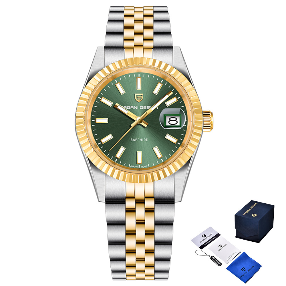 Представляємо годинник Pagani Design PD-1794M Silver-Gold-Green – ідеальний вибір для стильних чоловіків, які цінують якість та елегантність. Цей механічний годинник з автопідзаводом поєднує в собі сучасний дизайн і класичні елементи. Корпус зі сталі діаметром 39 мм вражає своїм сріблястим відтінком, доповненим золотими деталями, а сапфірове скло забезпечує високу прозорість і стійкість до подряпин. Годинник водонепроникний (до 50 м), що дозволяє носити його в будь-якій ситуації, від повсякденних до урочистих. Зручний сталевий браслет міцно фіксується на руці, а його довжина в 24 мм підходить для більшості зап'ясть. Циферблат з індексами демонструє години, хвилини та секунди, а люмінесцентні елементи дозволяють зчитувати час у темряві. З гарантією на 12 місяців, годинник Pagani Design PD-1794M стане не лише стильним аксесуаром, а й надійним супутником у ваших щоденних пригодах. Цей годинник успішно поєднує стиль, функціональність та якість, задовольняючи навіть найвибагливіші смаки.