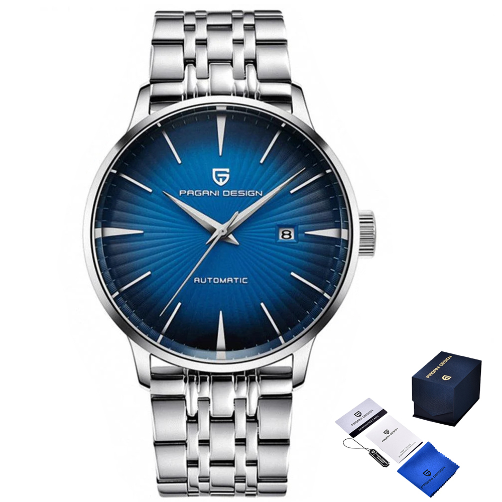 Pagani Design, механізм Механічний з автопідзаводом, корпус 43 х 43, матеріали Сталь, колір Сріблястий, форма Круглая, стиль Сasual, Класичний, індикація Стрілочний, тип кріплення Браслет, водозахист 30 м, скло Мінеральне