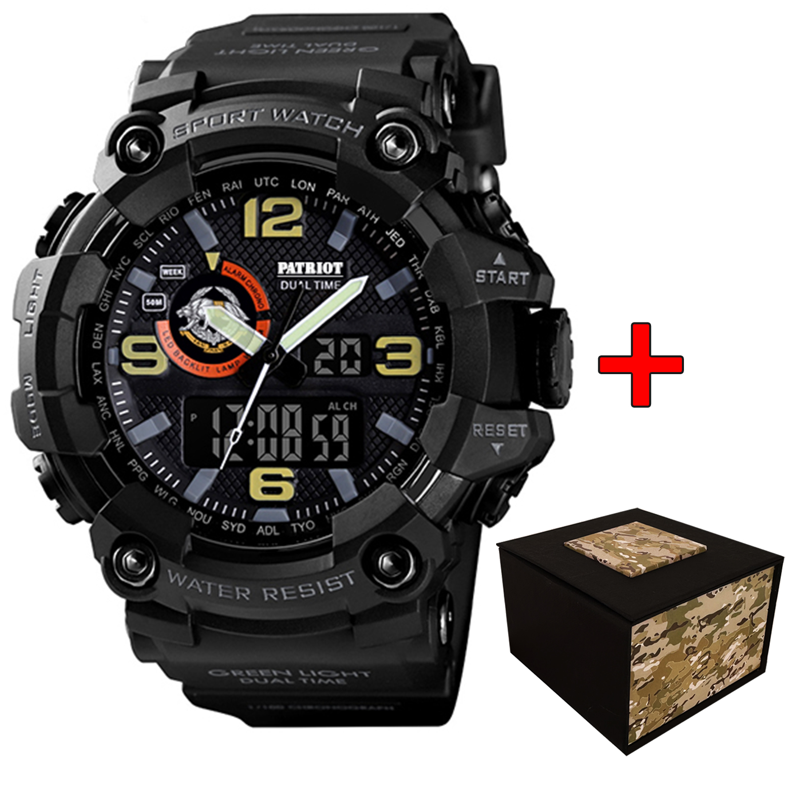Patriot, механізм Кварцовий, корпус 56 х 56, матеріали Полімер / Каучук, колір Чорний, форма Кругла, стиль Спортивний, Армійський, індикація Стрілочно-електронний, тип кріплення Ремінець, водозахист 50 м, скло Полімерне