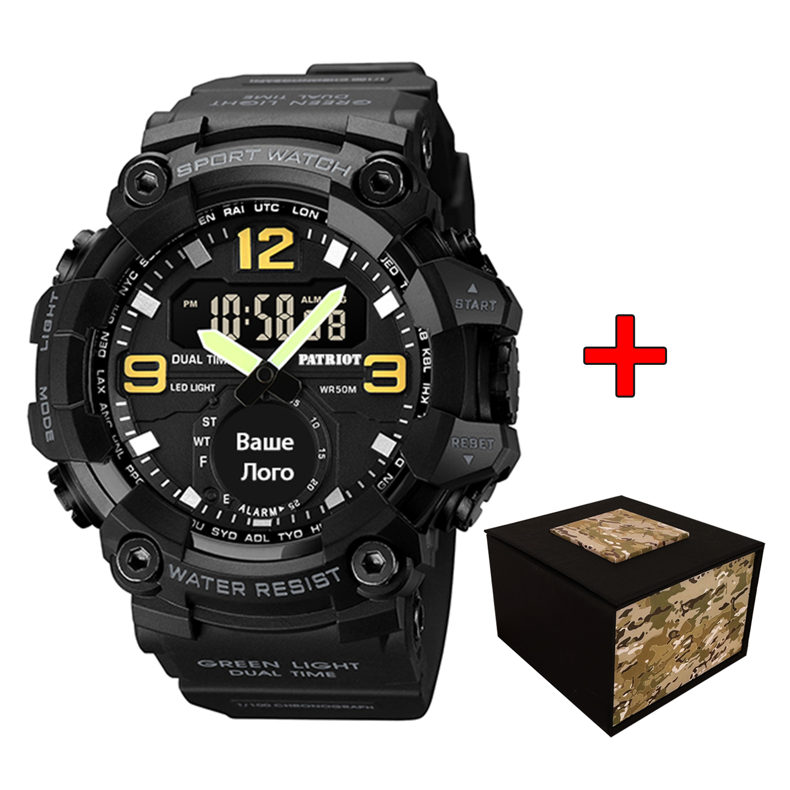 Patriot, механізм Кварцовий, корпус 54 х 58, матеріали Полімер / Каучук, колір Чорний, форма Кругла, стиль Спортивний, Армійський, індикація Стрілочно-електронний, тип кріплення Ремінець, водозахист 50 м, скло Полімерне