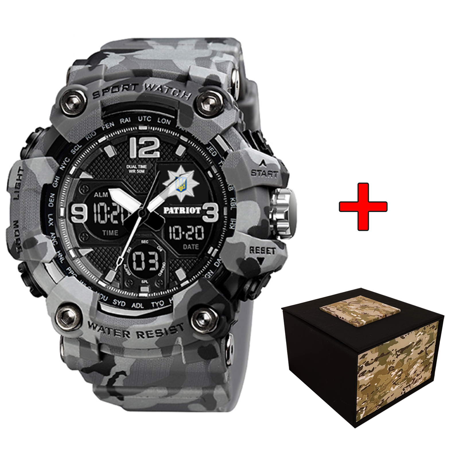 Patriot, механізм Кварцовий, корпус 50 х 50, матеріали Полімер / Каучук, колір Сірий камуфляж, форма Кругла, стиль Спортивний, індикація Стрілочно-електронний, тип кріплення Ремінець, водозахист 50 м, скло Полімерне