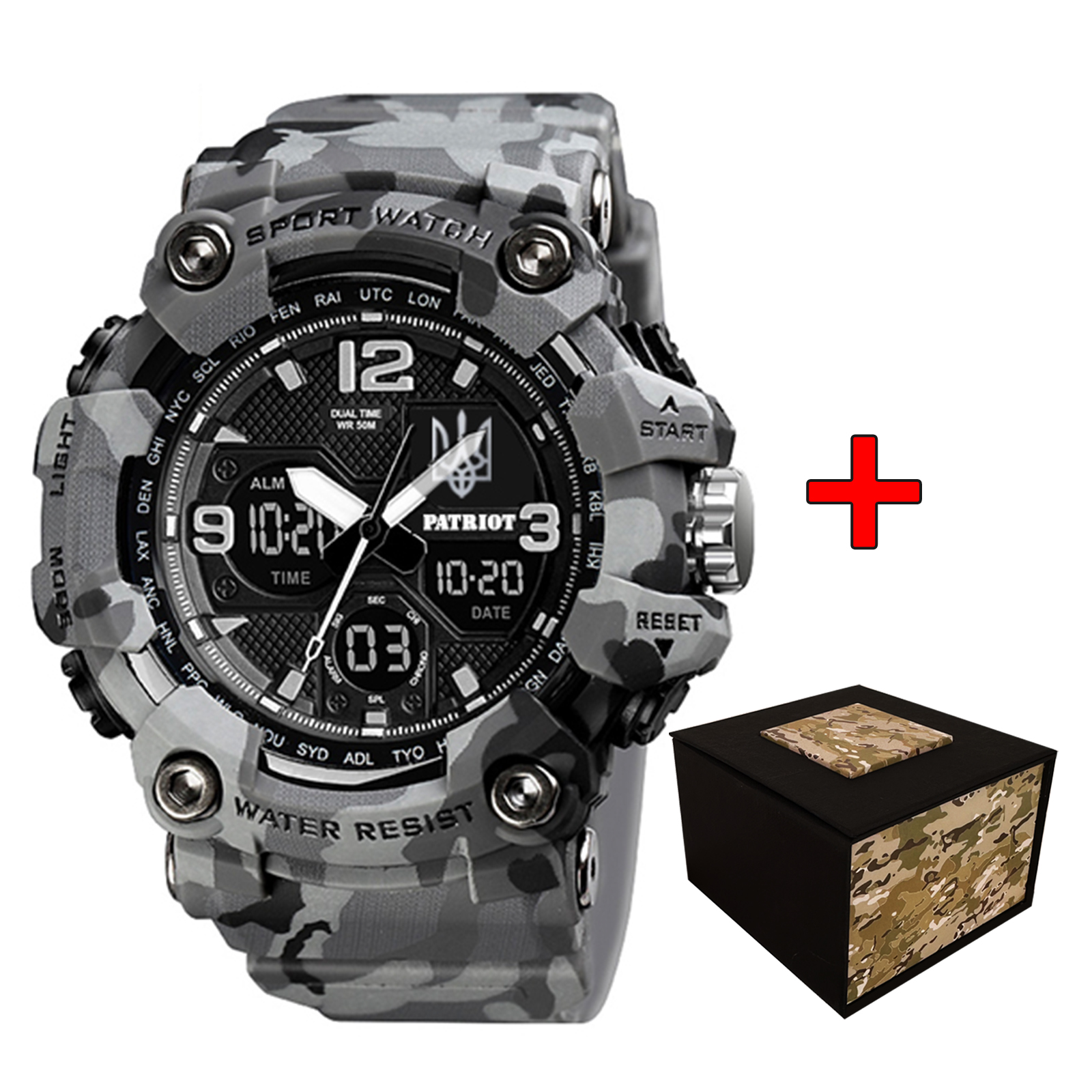 Patriot, механізм Кварцовий, корпус 55 х 55, матеріали Полімер / Каучук, колір Камуфляж, форма Кругла, стиль Спортивний, Армійський, індикація Стрілочно-електронний, тип кріплення Ремінець, водозахист 50 м, скло Полімерне