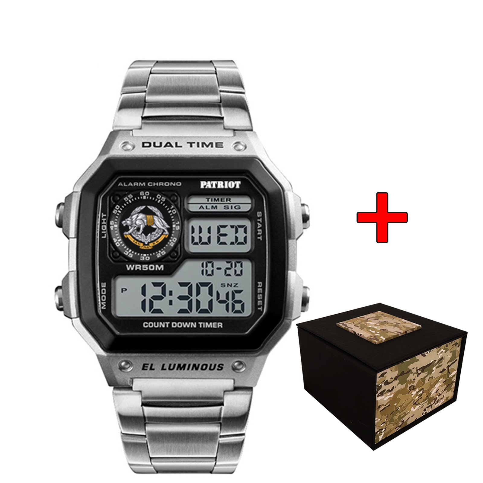 Patriot, механізм Електронний, корпус 45 х 43, матеріали Полікарбонат / Нержавіюча сталь, колір Чорний / Сріблястий, форма Квадратна, стиль Спортивний, Сasual, індикація Електронний, тип кріплення Браслет, водозахист 50 м, скло Полімерне