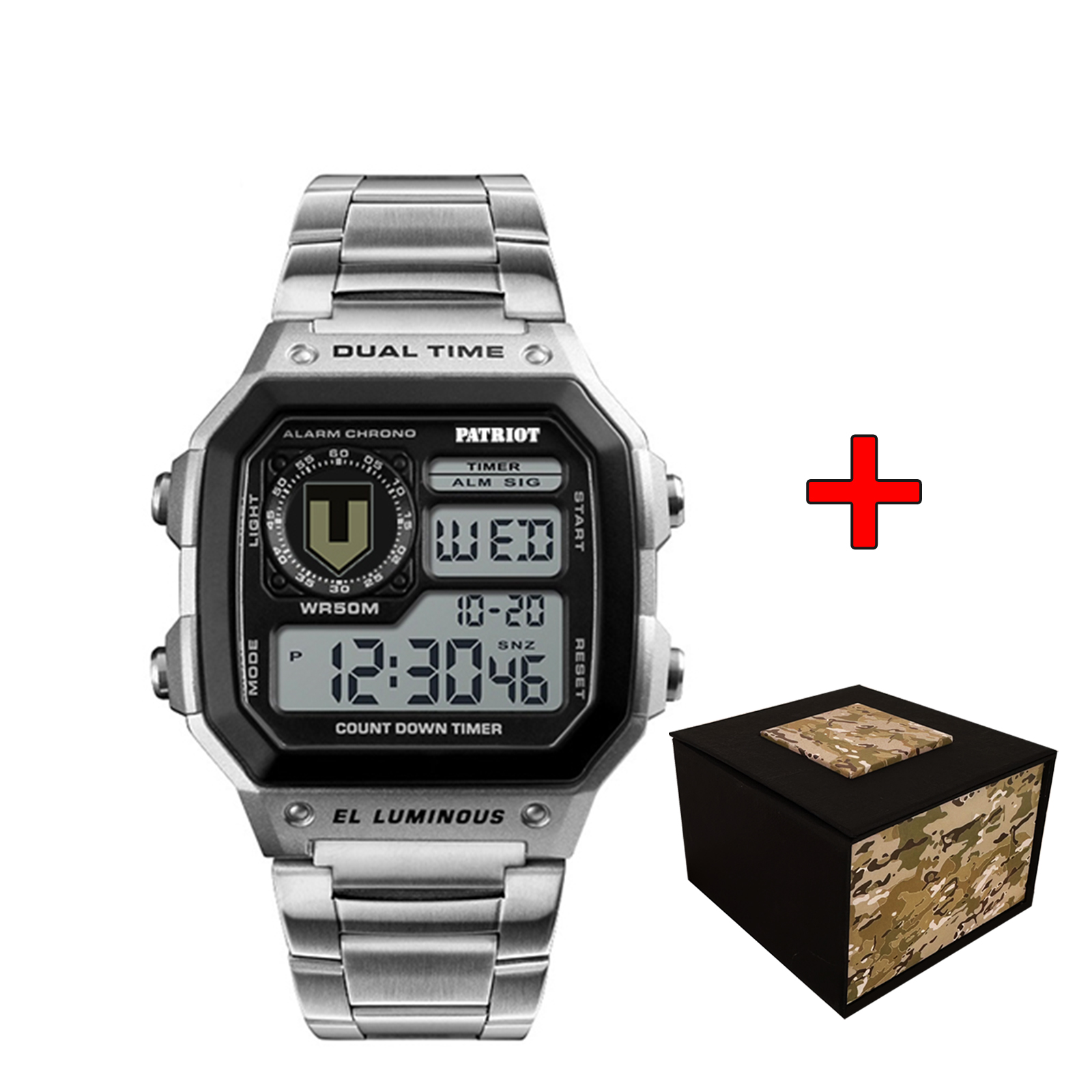 Patriot, механізм Електронний, корпус 45 х 43, матеріали Полікарбонат / Нержавіюча сталь, колір Чорний / Сріблястий, форма Квадратна, стиль Спортивний, Сasual, індикація Електронний, тип кріплення Браслет, водозахист 50 м, скло Полімерне