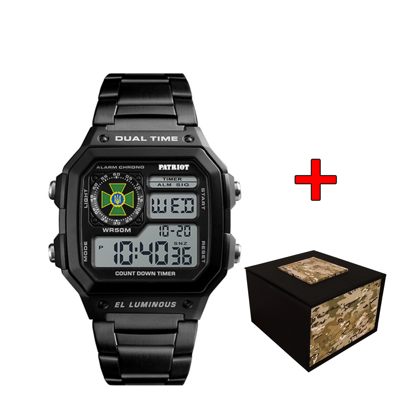 Patriot, механізм Електронний, корпус 45 х 43, матеріали Полікарбонат / Нержавіюча сталь, колір Чорний, форма Квадратна, стиль Спортивний, Сasual, індикація Електронний, тип кріплення Браслет, водозахист 50 м, скло Полімерне
