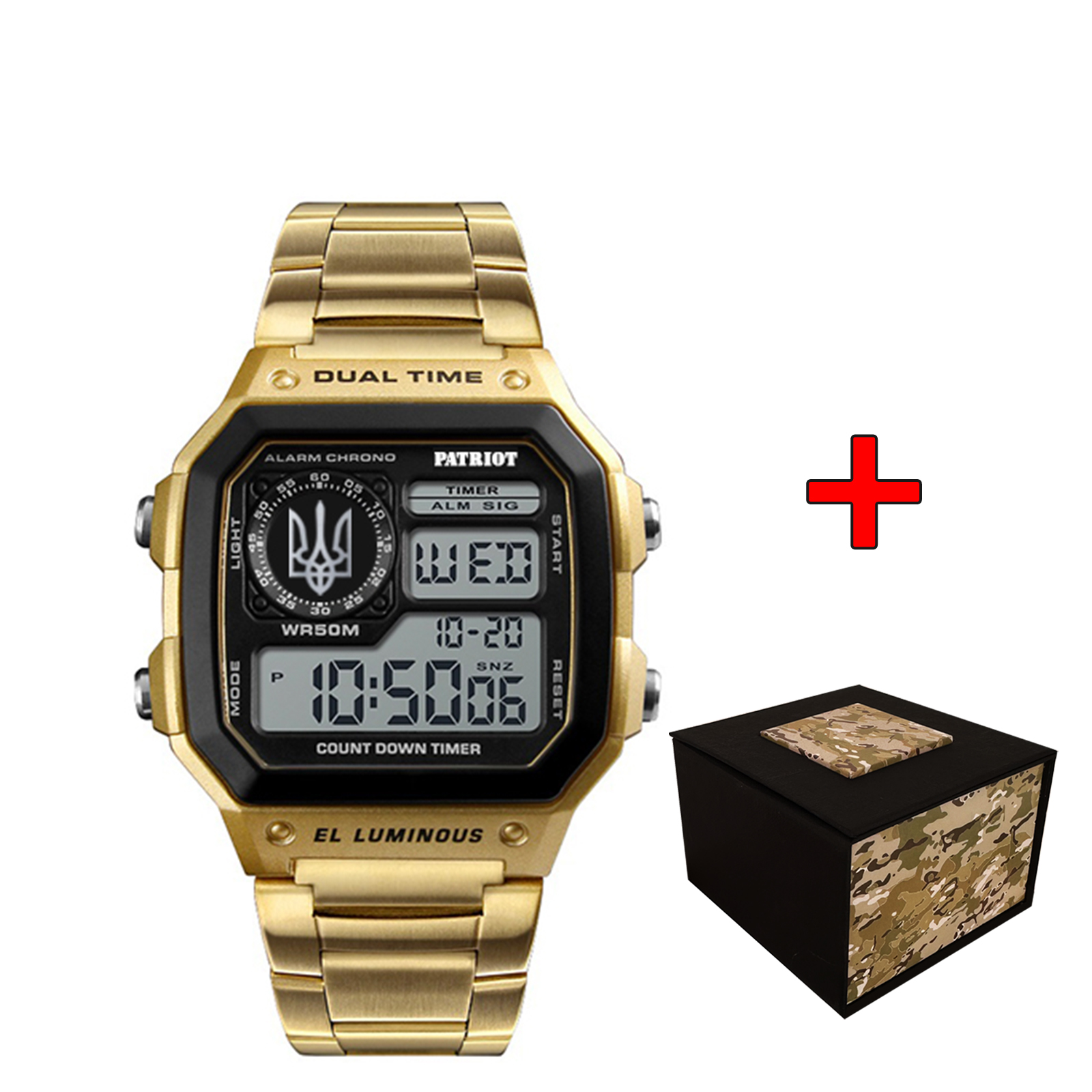 Patriot, механізм Електронний, корпус 45 х 43, матеріали Полікарбонат / Нержавіюча сталь, колір Чорний / Золотистий, форма Квадратна, стиль Спортивний, Сasual, індикація Електронний, тип кріплення Браслет, водозахист 50 м, скло Полімерне