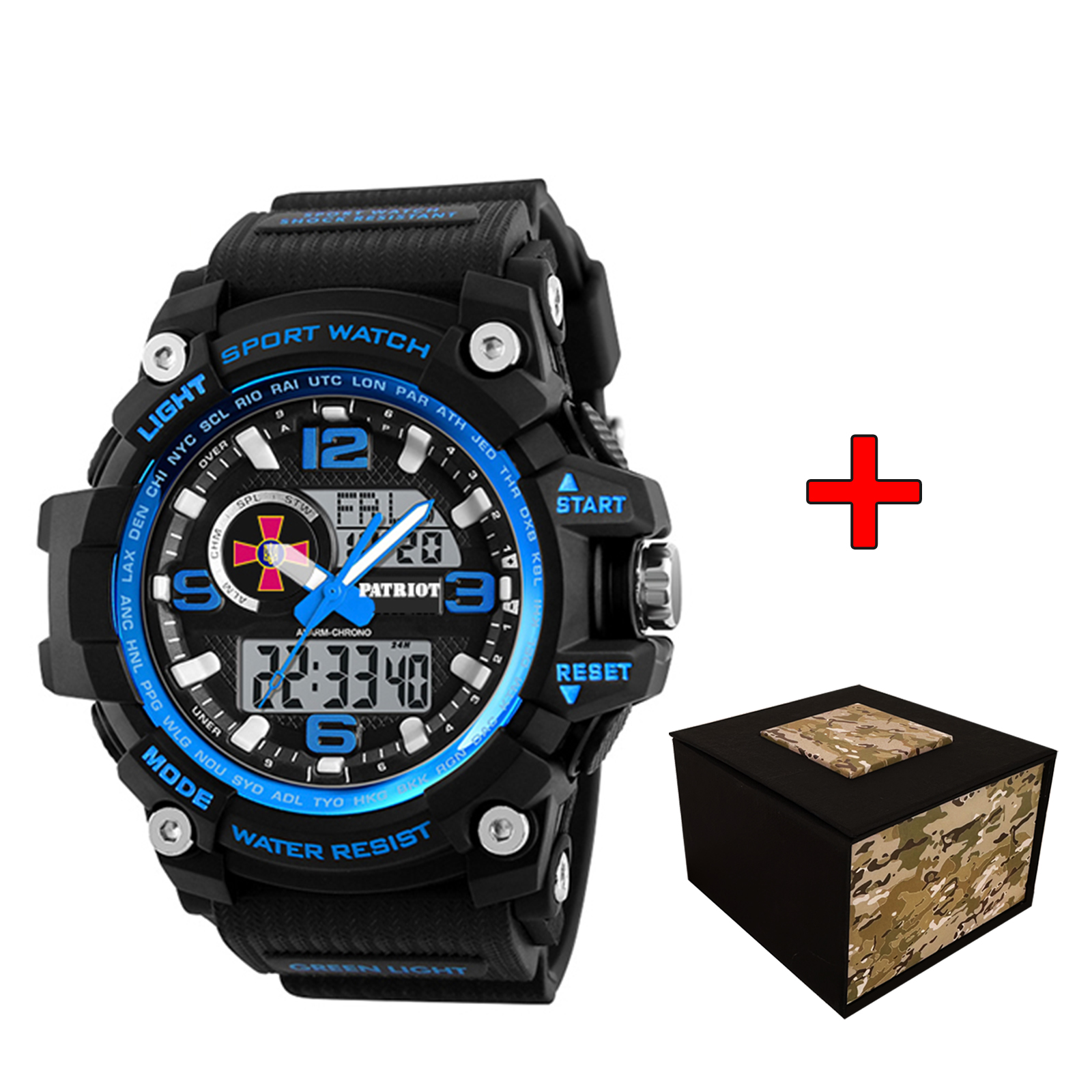 Patriot, механізм Електронний, корпус 52 х 52, матеріали Полімер, Каучук / Каучук, колір Чорний, форма Кругла, стиль Спортивний, індикація Стрілочно-електронний, тип кріплення Ремінець, водозахист 30 м, скло Hardlex crystal
