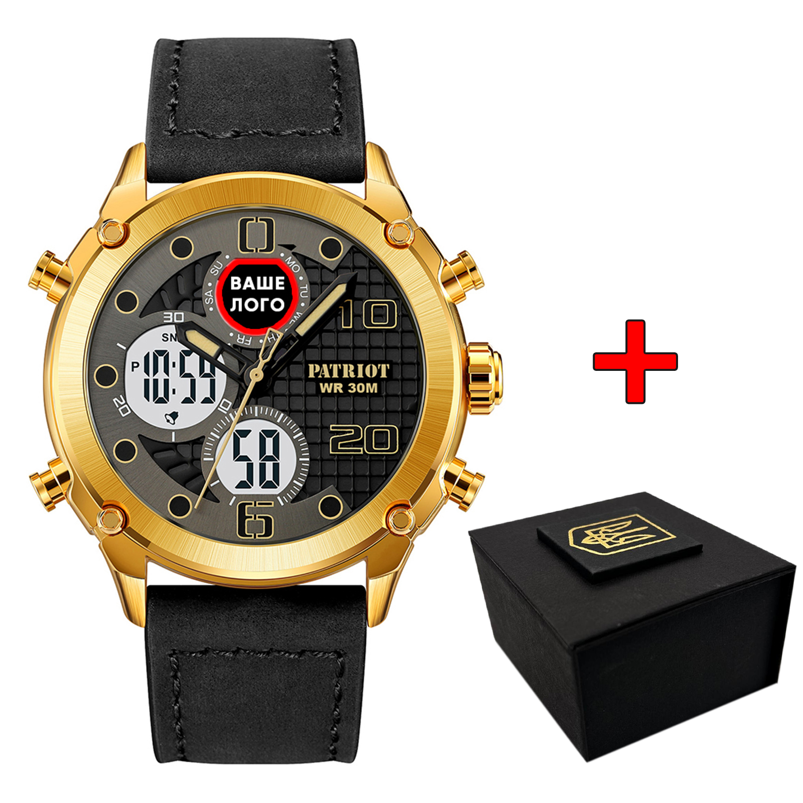Patriot, механізм Кварцовий, корпус 52,9 х 45,9, матеріали Метал / Шкіра, колір Золотистий / Чорний, форма Кругла, стиль Сasual, Класичний, індикація Стрілочно-електронний, тип кріплення Ремінець, водозахист 30 м, скло Полімерне
