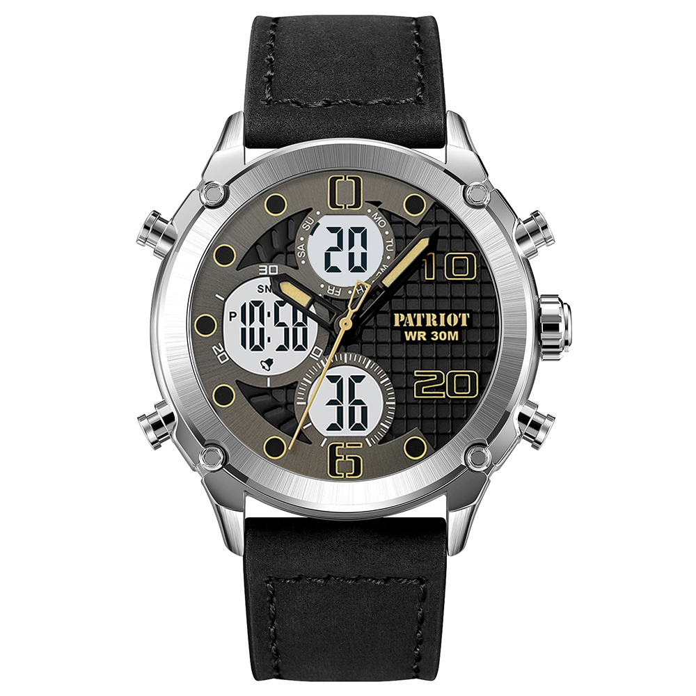 Patriot, механізм Кварцовий, корпус 52,9 х 45,9, матеріали Метал / Шкіра, колір Сріблястий / Чорний, форма Кругла, стиль Сasual, Класичний, індикація Стрілочно-електронний, тип кріплення Ремінець, водозахист 30 м, скло Полімерне