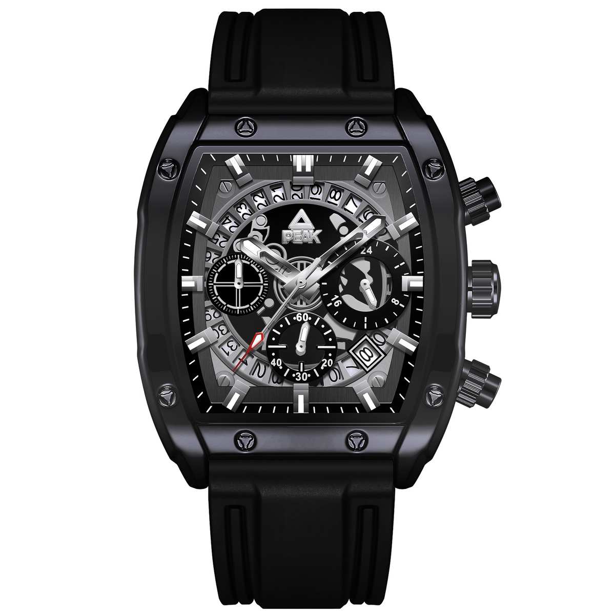 Peak X, механізм Кварцовий, корпус 42х13, матеріали Сталь / Каучуковий / Метал, колір Чорний, форма Прямокутний, стиль Класичний, індикація Аналоговий (стрілочний), тип кріплення Ремінець, скло Мінеральне