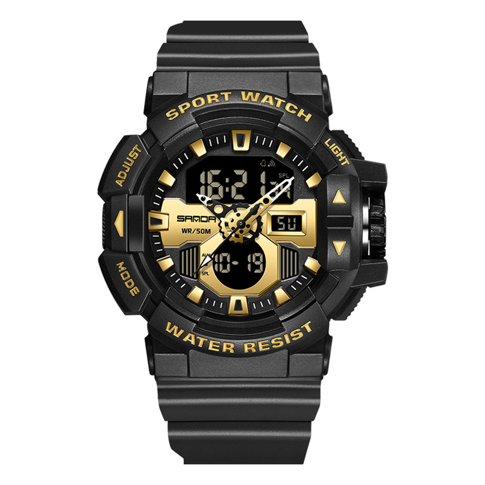 Годинники Sanda 3129 Black-Gold: Спортивний стиль у вашій руці Відчуйте справжній спортивний дух з годинником Sanda 3129 Black-Gold! Цей елегантний та функціональний аксесуар, виконаний у чорному кольорі з елементами золота, стане ідеальним доповненням до вашого образу. Модель має водонепроникність до 50 метрів, що робить її чудовим вибором для активних занять спортом. Годинник оснащений електронним механізмом і комбінованим циферблатом, який відображає години, хвилини та секунди. Додаткові функції, такі як будильник, календар, світовий час і секундомір, роблять його практичним помічником в повсякденному житті. Акрилове скло та полімерний корпус гарантують легкість і стійкість до ударів, а каучуковий ремінець забезпечує комфорт під час носіння. З діаметром корпусу 51 мм та вагою всього 90 грам, Sanda 3129 Black-Gold вдало поєднує стиль та ергономічність. Не упустіть можливість придбати цей унікальний годинник, що має 12-місячну гарантію!