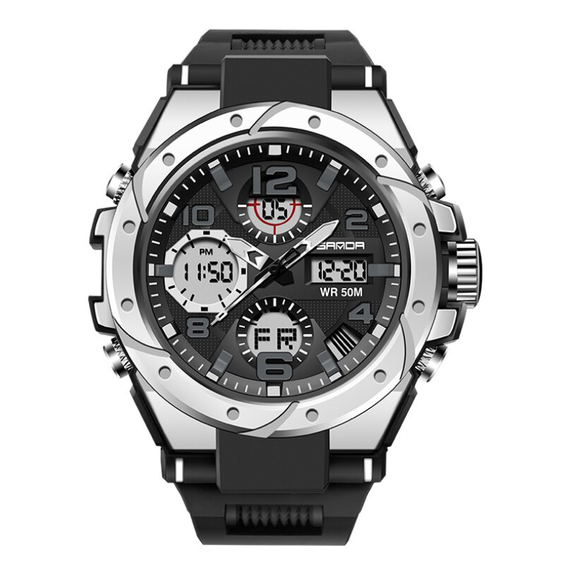 Sanda, механізм Кварцовий, корпус 53 х 49, матеріали Нержавіюча сталь / Каучук, колір Сріблястий / Чорний, форма Кругла, стиль Спортивний, Сasual, індикація Стрілочно-електронний, тип кріплення Ремінець, водозахист 50 м, скло Hardlex crystal