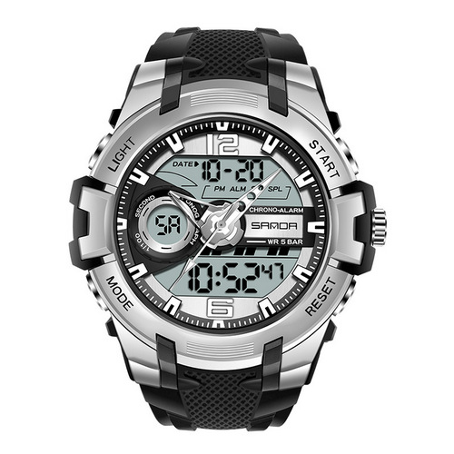 Sanda, механізм Кварцовий, корпус 54 х 49, матеріали Поліуретан / Каучук, колір Сріблястий / Чорний, форма Кругла, стиль Спортивний, Сasual, індикація Стрілочно-електронний, тип кріплення Ремінець, водозахист 50 м, скло Hardlex crystal