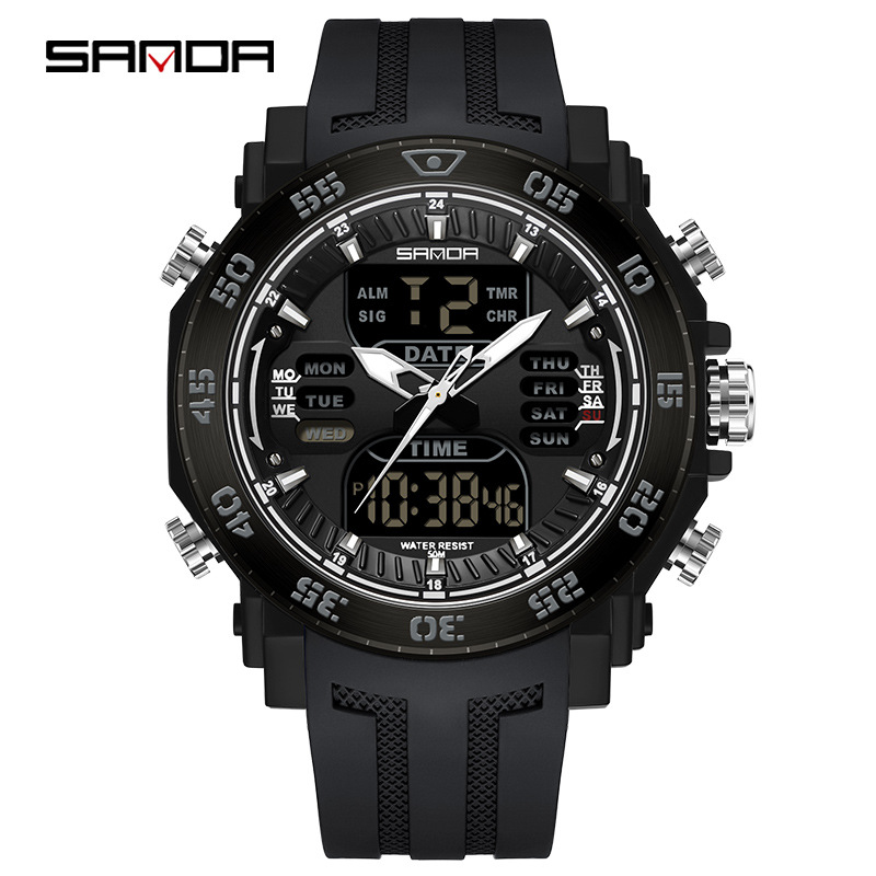 Sanda, механізм Кварцовий, корпус 53 х 47, матеріали Нержавіюча сталь / Каучук, колір Чорний, форма Кругла, стиль Спортивний, Сasual, індикація Стрілочно-електронний, тип кріплення Ремінець, водозахист 50 м, скло Hardlex crystal
