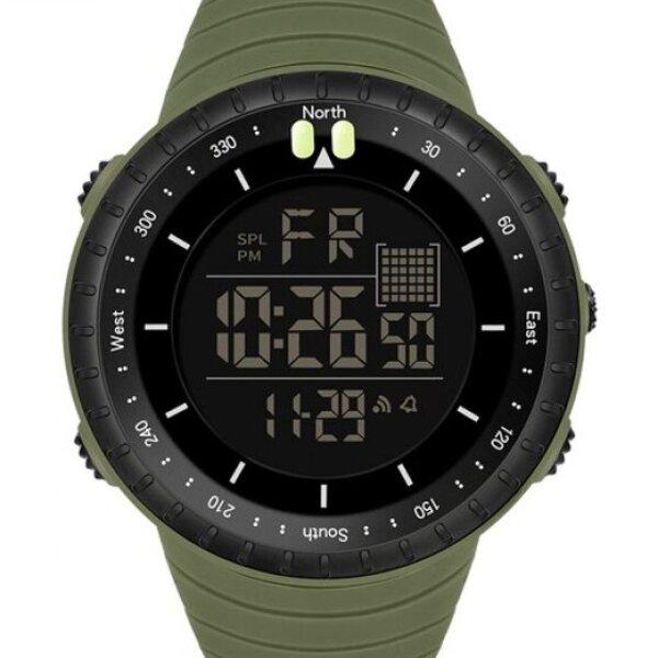 Sanda, механізм Кварцовий, корпус 45х15, матеріали Полікарбонат / Каучуковий / Пластик, колір Темно-зелений Армі, форма Круглий, стиль Спортивний, індикація Цифровий (електронний), тип кріплення Ремінець, скло Полікарбонатне