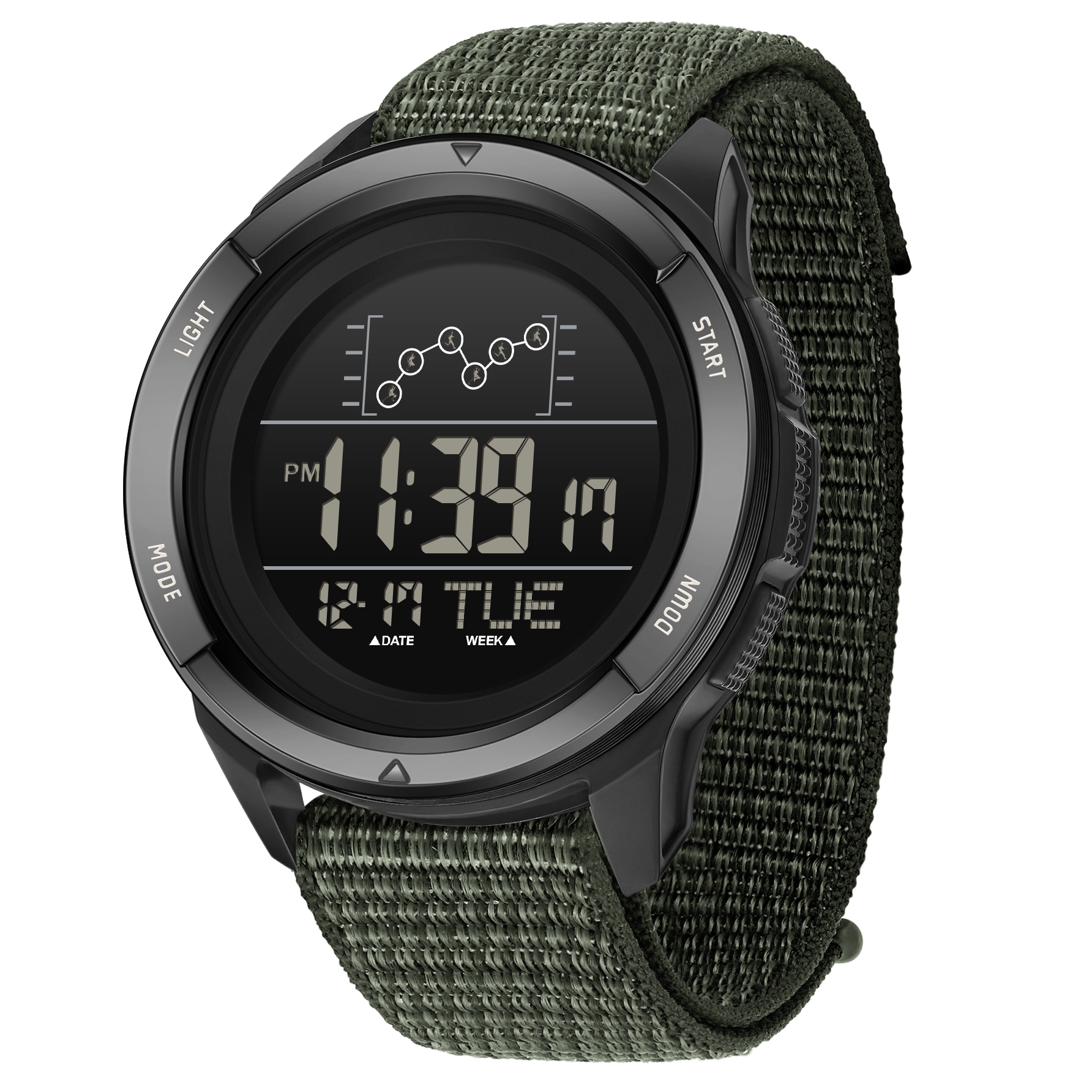 Sanda, механізм Кварцовий, корпус 47х14, матеріали Полікарбонат / Тканевий / Пластик, колір Чорний / Темно-зелений Армі, форма Круглий, стиль Спортивний, індикація Цифровий (електронний), тип кріплення Ремінець, скло Полікарбонатне