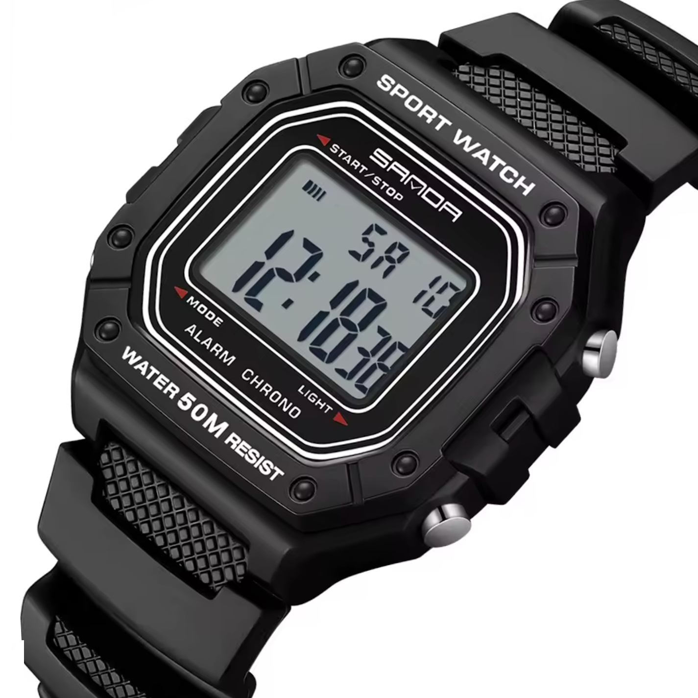 Sanda, механізм Кварцовий, корпус 42х13, матеріали Полікарбонат / Каучуковий / Пластик, колір Чорний, форма Прямокутний, стиль Спортивний, індикація Цифровий (електронний), тип кріплення Ремінець, скло Полікарбонатне