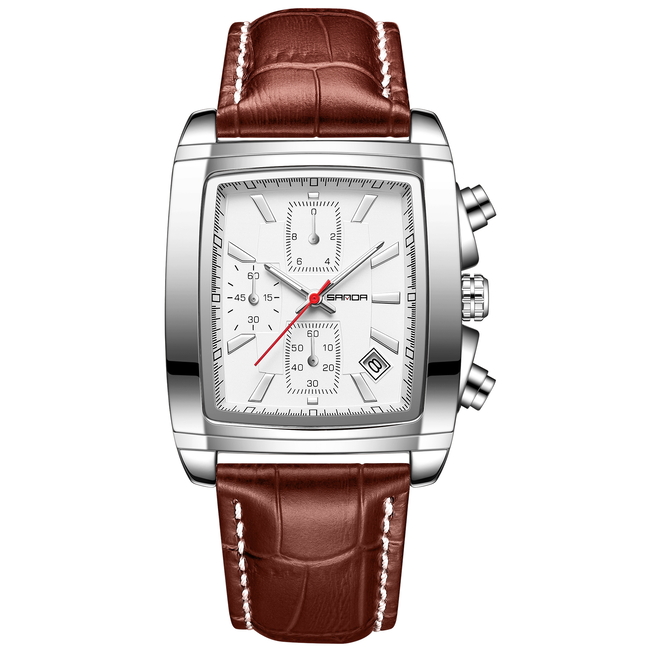 Sanda, механізм Кварцовий, корпус 40x37x12, матеріали Сталь / Шкіряний / Метал, колір Сріблястий / Коричневий, форма Прямокутний, стиль Класичний, індикація Аналоговий (стрілочний), тип кріплення Ремінець, скло Мінеральне