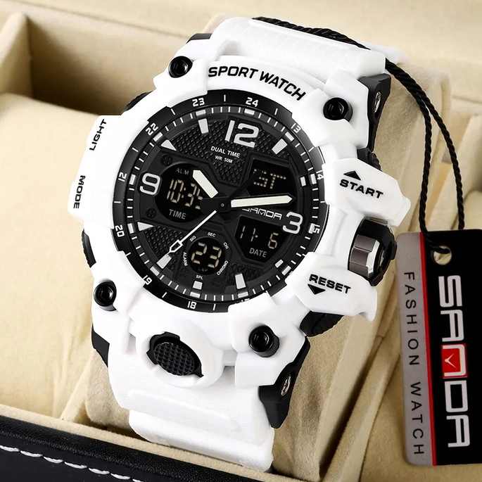 Sanda, механізм Кварцовий, корпус 48х14, матеріали Полікарбонат / Каучуковий / Пластик, колір Білий, форма Круглий, стиль Спортивний, індикація Комбінований (аналогово-стрілочний), тип кріплення Ремінець, скло Полікарбонатне