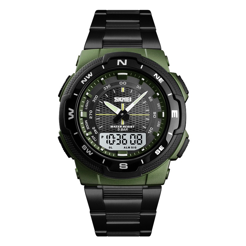 Skmei, механізм Кварцовий, корпус 49 х 47, матеріали Полімер / Сталь, колір Зелений / Чорний, форма Кругла, стиль Спортивний, Сasual, індикація Стрілочно-електронний, тип кріплення Браслет, водозахист 50 м, скло Полімерне