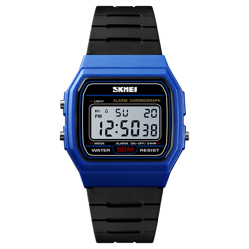 Skmei, механізм Електронний, корпус 38 х 35, матеріали Полімер / Каучук, колір Синій / Чорний, форма Прямокутна, стиль Спортивний, Сasual, індикація Електронний, тип кріплення Ремінець, водозахист 50 м, скло Полімерне