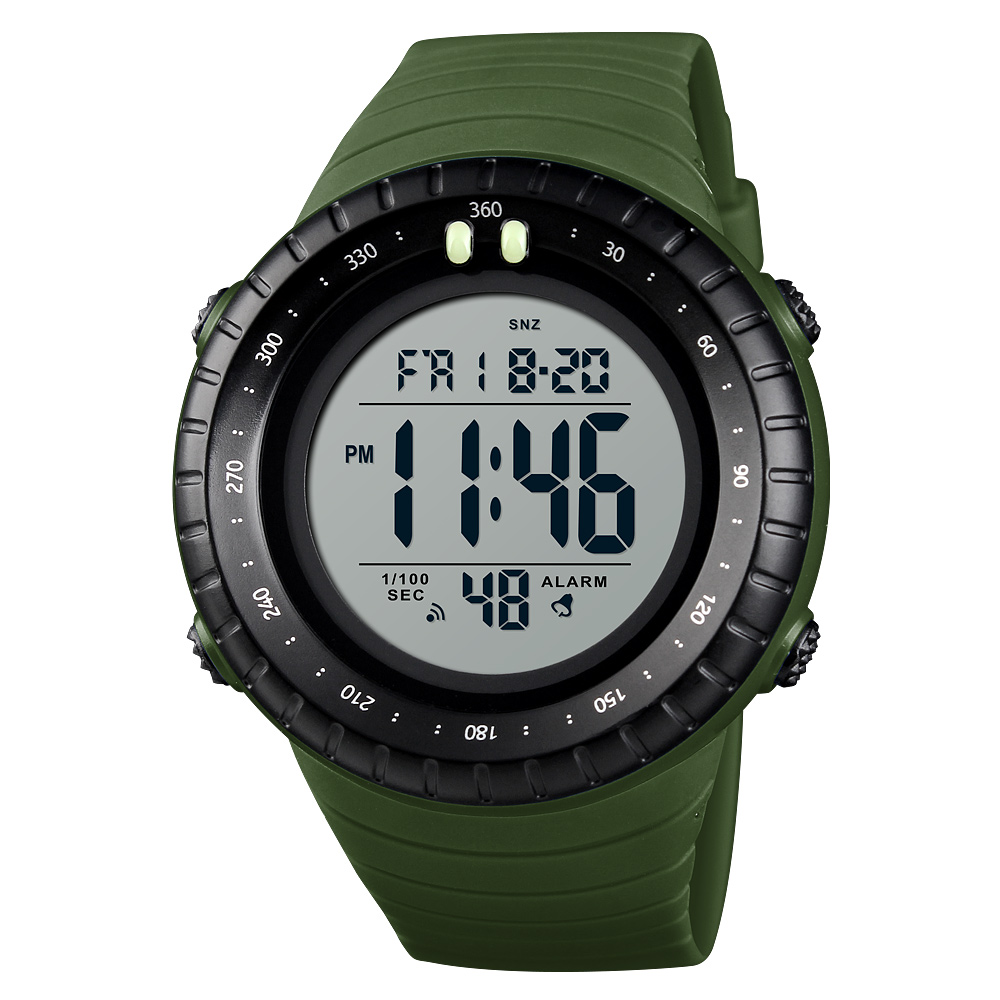 Skmei, механізм Електронний, корпус 37 х 37, матеріали Полімер, колір Зелений, форма Кругла, стиль Спортивний, індикація Електронний, тип кріплення Ремінець, водозахист 50 м, скло Акрилове
