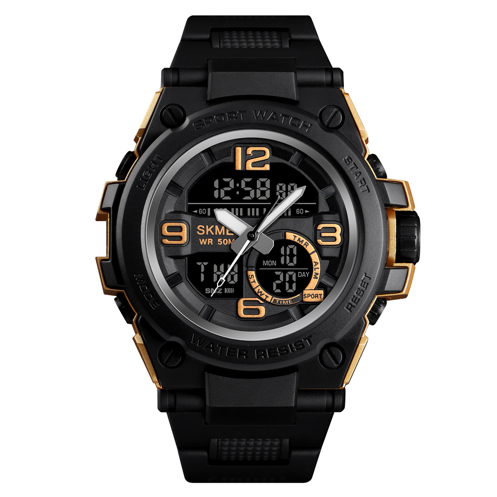 Skmei, механізм Електронний, корпус 40 х 40, матеріали Полімер, колір Чорний, форма Кругла, стиль Спортивний, індикація Стрілочно-електронний, тип кріплення Ремінець, водозахист 50 м, скло Акрилове