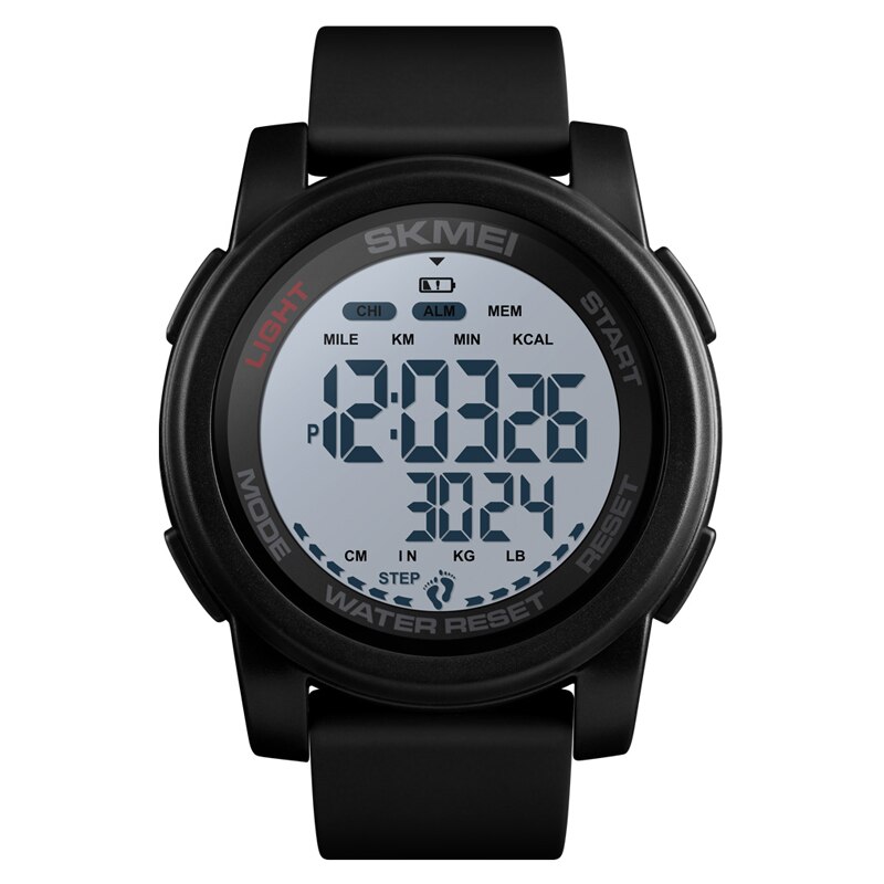 Skmei, механізм Електронний, корпус 57 х 50, матеріали Полімер / Силікон, колір Чорний, форма Кругла, стиль Спортивний, Сasual, індикація Електронний, тип кріплення Ремінець, водозахист 50 м, скло Полімерне