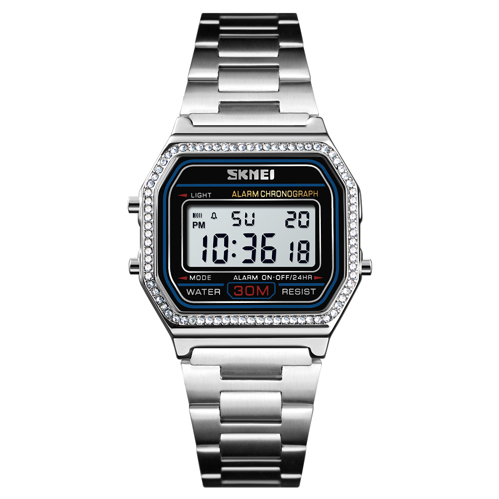 Skmei, механізм Електронний, корпус 37 х 34, матеріали Метал / Нержавіюча сталь, колір Сріблястий, форма Квадратна, стиль Сasual, Класичний, індикація Електронний, тип кріплення Браслет, водозахист 30 м, скло Полімерне