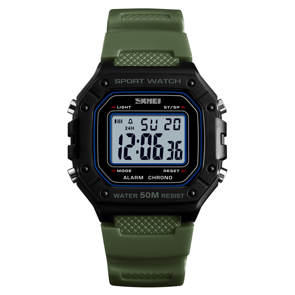 Skmei, механізм Електронний, корпус 44 х 43, матеріали Полімер / Каучук, колір Чорний / Зелений, форма Квадратна, стиль Спортивний, Сasual, індикація Електронний, тип кріплення Ремінець, водозахист 50 м, скло Полімерне
